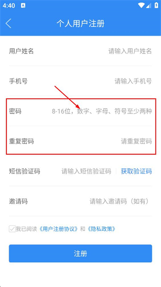 4、我们可以在个人用户注册页面,填写符合要求的密码和重复密码。