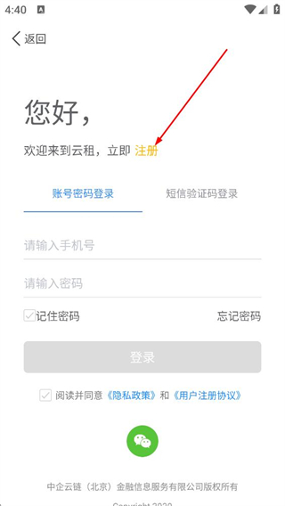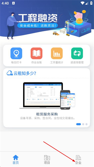 1、在中企云租首页,点击底部的企业选项,进入登录相关页面。
