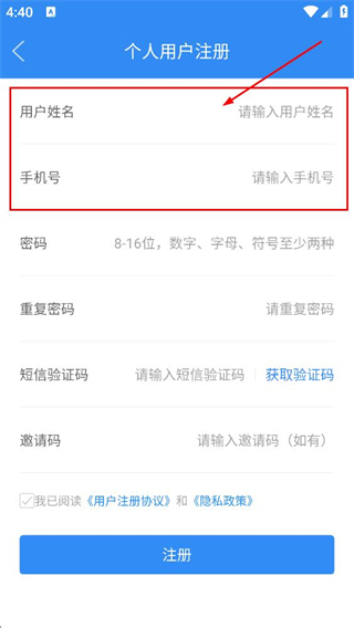 3、在个人用户注册页面,填写用户姓名和手机号,进行下一步操作。