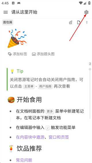 1、在思源笔记指南页面,点击右上角的设置,进入功能菜单页面。