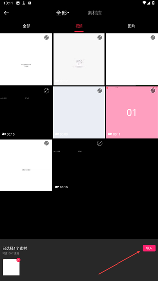 2、进入素材选择页面,从相册中挑选想要同框的视频素材,选好后点击右下角的导入按钮。