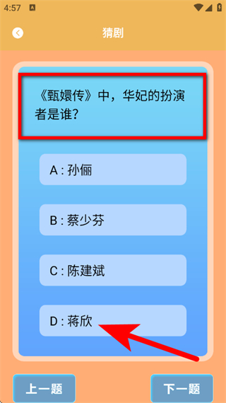 2、在猜剧答题页面,针对题目,选择对应的正确选项。