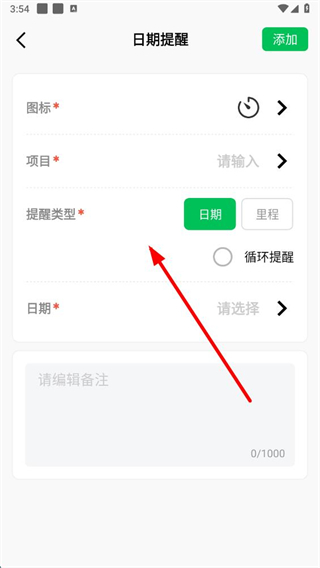 4、在日期提醒页面,依次设置图标、项目、提醒类型、日期等信息后点击添加按钮完成提醒功能设置。