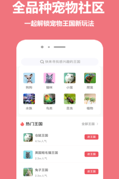 宠物王国app南京一宠科技开发的宠物王国APP,是连接流浪宠物与爱心主人的桥梁,通过规范透明的领养流程,为被抛弃的毛孩子匹配温暖家庭,它还是优质养宠交流平台,细分社区让用户分享心得,新手可借专业训练课程、健康管理指南快速入门,更有宠物成长档案、疫苗记录等功能,积分商城可换养宠好物。