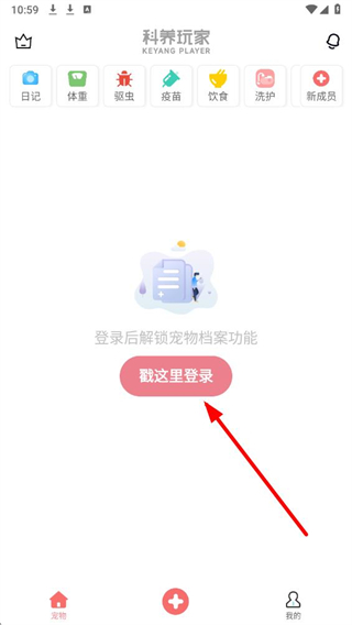 1、进入宠物王国app,在页面中点击戳这里登录按钮,进入账号登录的操作界面。