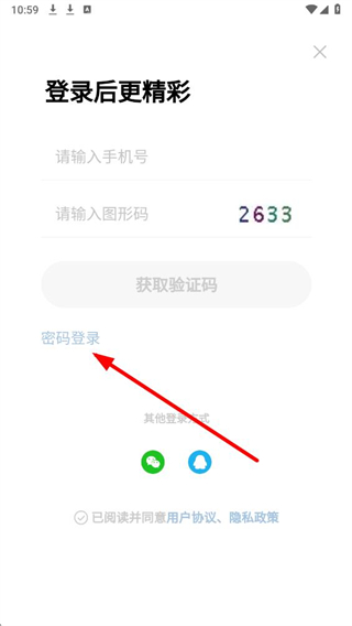 2、在登录界面中,点击密码登录选项,切换至密码登录的填写页面。
