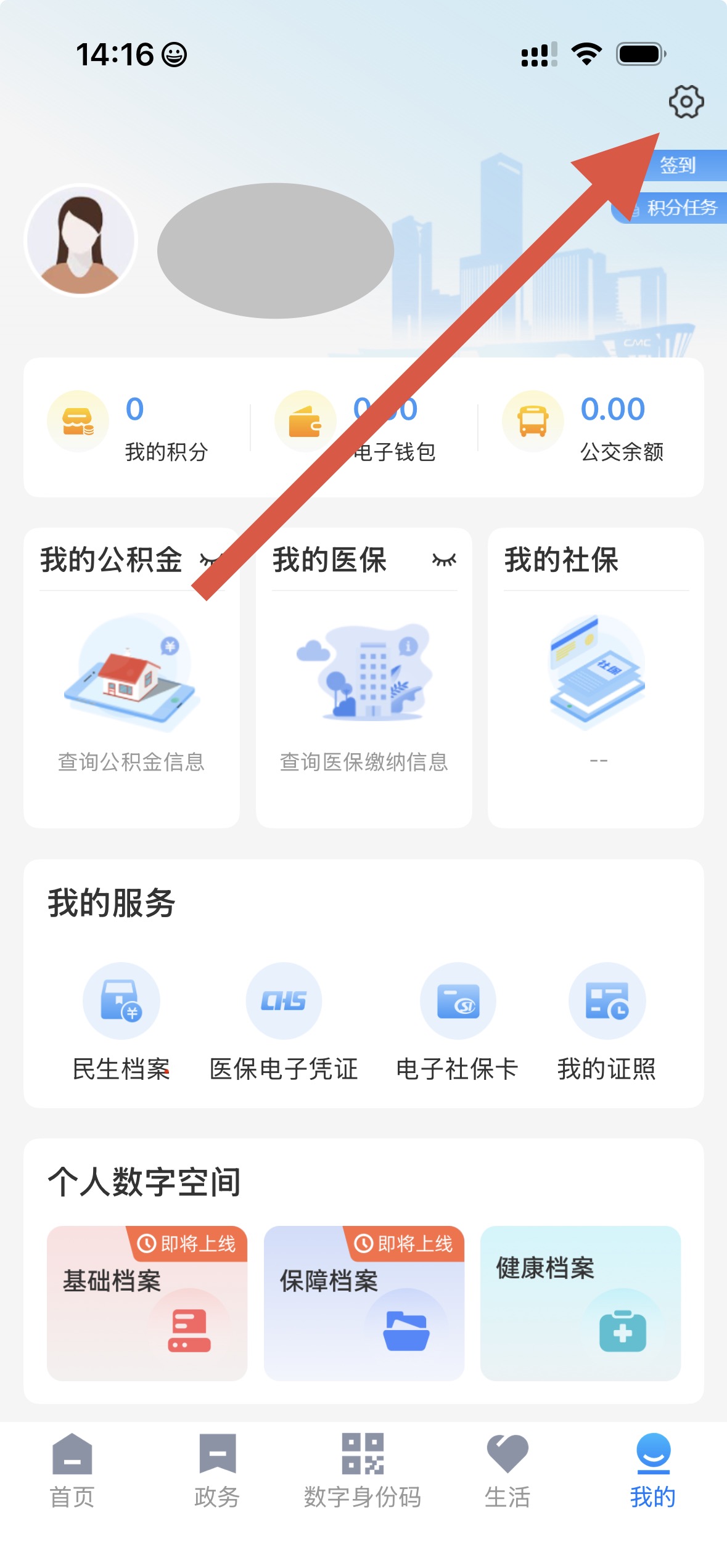 1、打开泰州通app,进入我的页面,点击右上角设置图标。