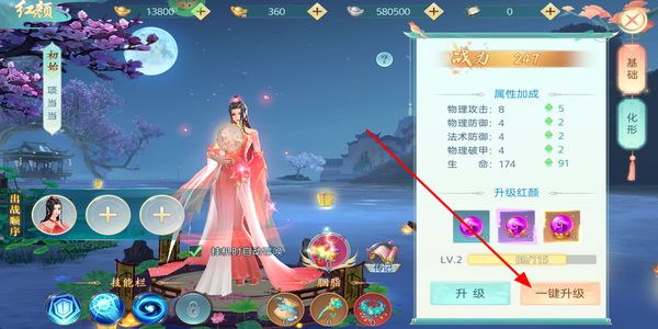 4、红颜界面点击一键升级的按键,消耗道具提升红颜等级,获取对应的属性加成效果。