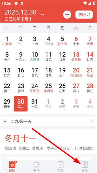1、打开日历通App,点击页面底部右侧的更多选项。