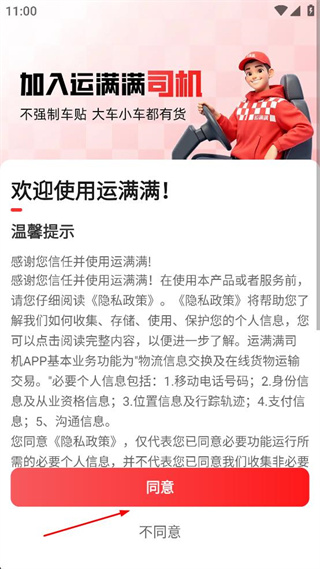 1、打开运满满司机APP,查看弹出的温馨提示及隐私政策,点击“同意”按钮继续。