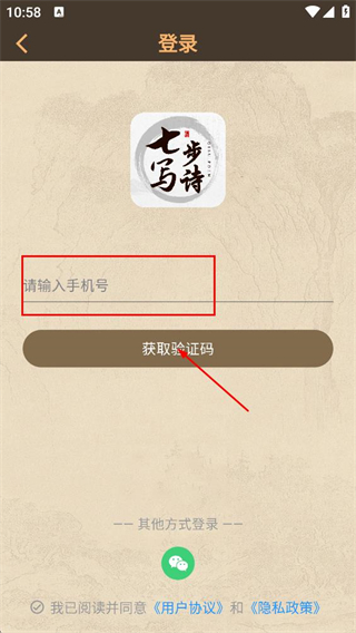 3、在登录页面,填写请输入手机号,点击获取验证码按钮。