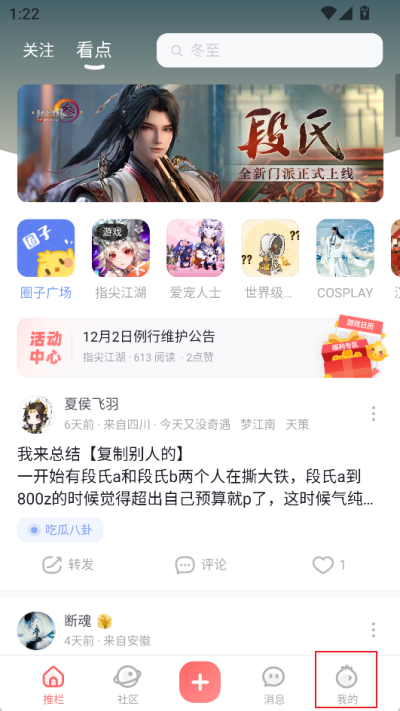 1、首先打开下载好的推栏APP,进入软件后点击界面右下方【我的】;