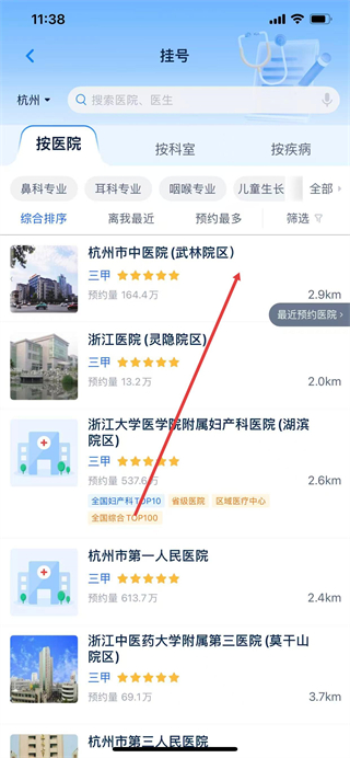 2、在挂号页面选择目标医院,进入医院详情页。