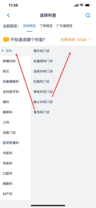 4、在选择科室页面,选择对应科室。