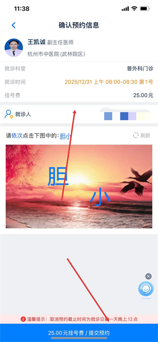 8、在确认预约信息页面,完成验证、核对就诊信息后,点击提交预约完成挂号。