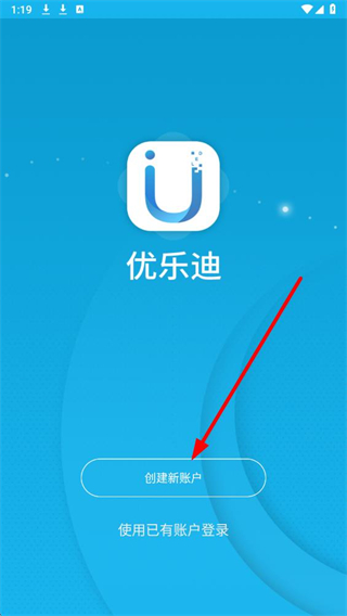 1、进入优乐迪app,在启动页点击创建新账户按钮,进入账号注册的流程页面。