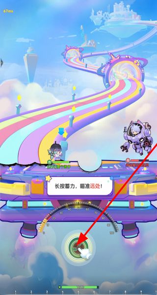 2、在弹射场景中长按蓄力按钮,根据蓄力进度调整弹射力度,松开按钮将炮弹弹射出去推进流程。