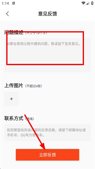 3、问题描述框中输入内容,点击立即反馈即可完成操作。