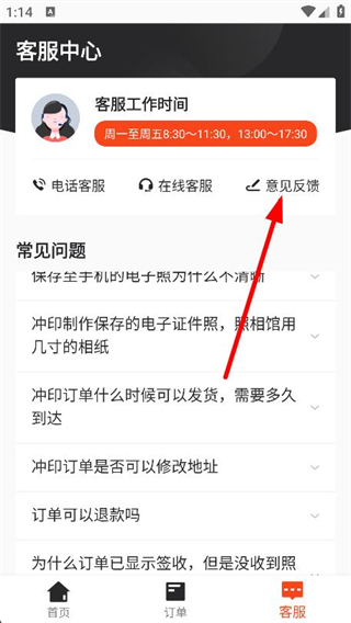 2、进入客服中心页面,找到并点击上方的意见反馈选项。