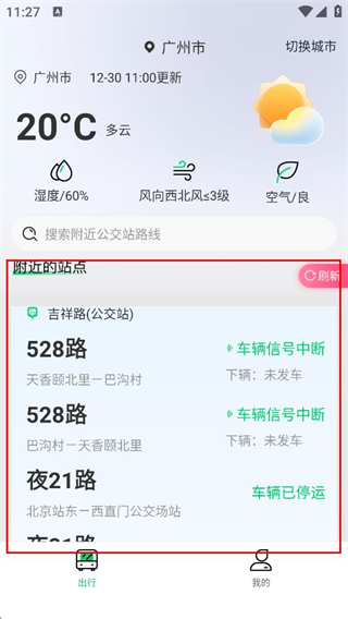 3、切换城市后,在出行页面查看附近的站点,对应的公交路线信息。