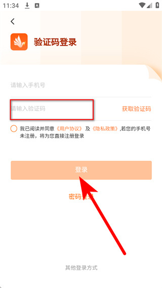 4、将收到的短信验证码填入验证码栏,勾选相关协议后,点击登录完成账号登录。