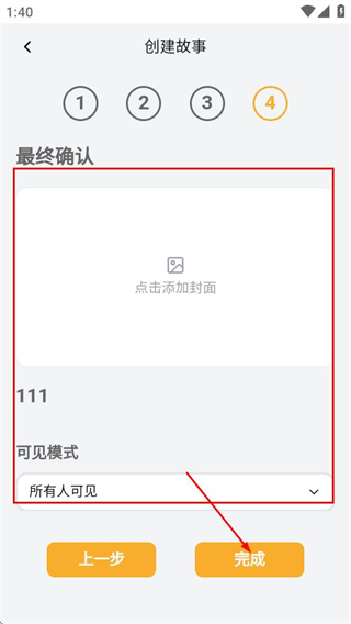 6、在确认页面,设置封面和可见模式后,点击完成按钮即可完成故事创建。