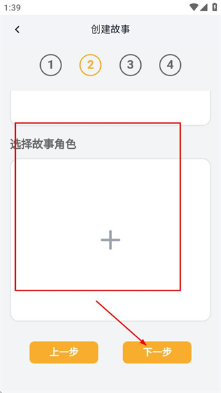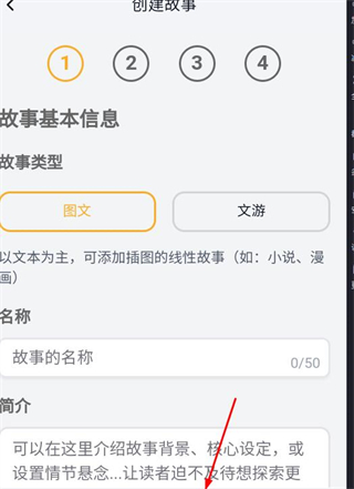 3、在基本信息页面,选择故事类型并填写名称简介后,点击下一步按钮。