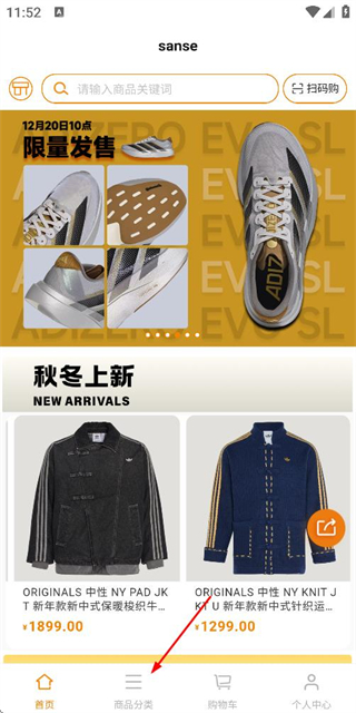 1、在首页点击底部的商品分类选项,进入商品分类页面。
