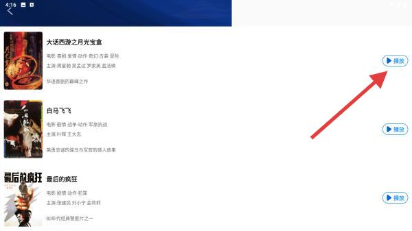 2、在影片列表中,点击目标影片右侧播放按钮直接启动;若需了解影片信息,可先点击封面查看简介、演职人员,确认后再触发播放,进入播放界面。