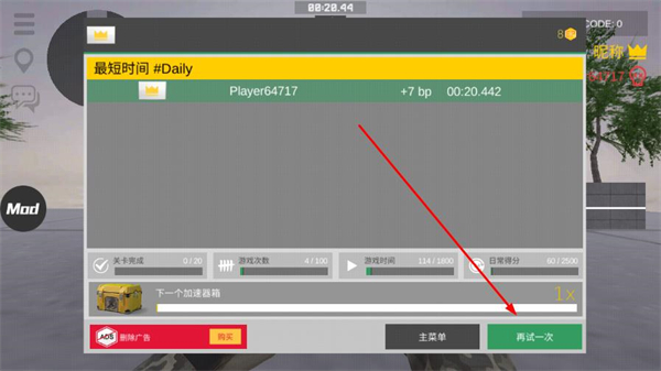 4、通关后会显示用时排名,可点击再试一次挑战更快成绩,或选择其他地图继续游玩。
