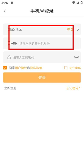 3、在手机号登录页面,选择国家/地区,填写手机号。