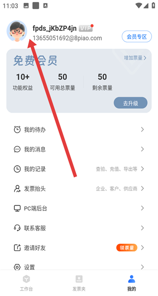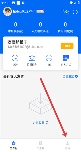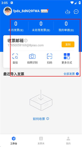 3、登录后进入工作台,可查看本月发票、未处理发票等数据,以及收票邮箱信息。