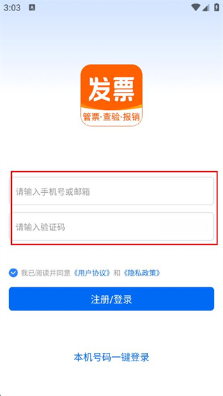 1、打开发票管理软件,在登录页面输入手机号或邮箱,点击获取验证码并输入。