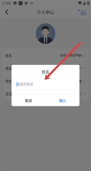 3、在个人信息编辑界面,点击姓名栏,弹出姓名输入窗口。