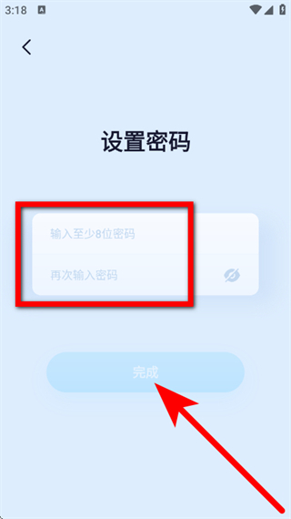 4、在设置密码页面,输入设置密码,点击完成,完成账号注册。