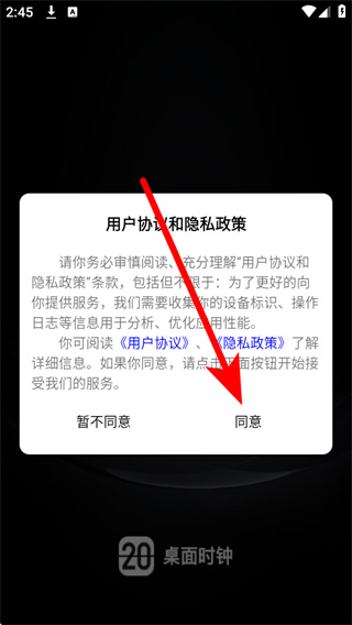 1、打开翻页桌面时钟后,弹出弹窗,点击同意,进入主界面。