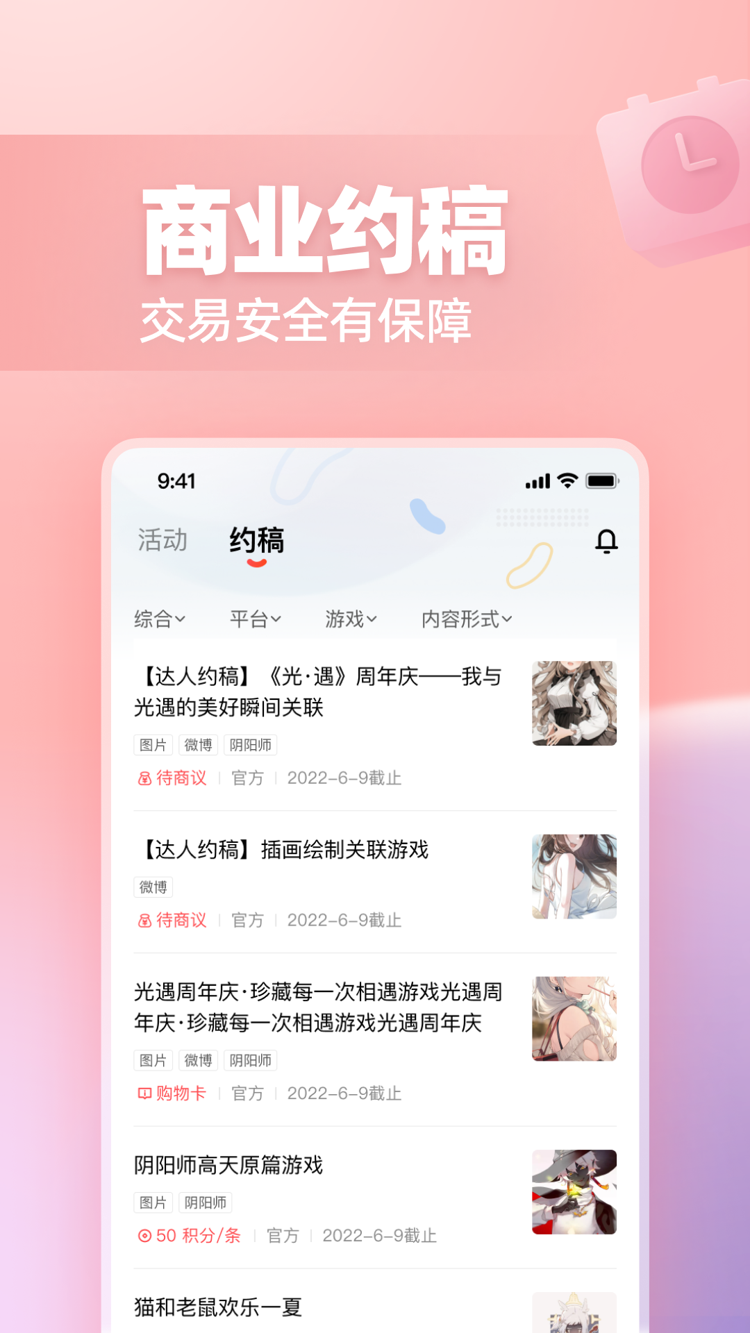2、约稿板块:参与应征商单推广任务,直接和官方合作产粮;
