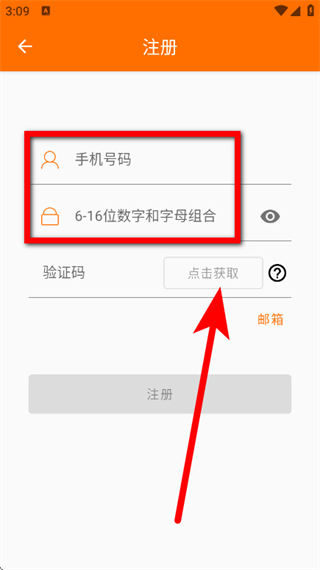 3、在注册页面,输入手机号码,设置密码,点击获取验证码。