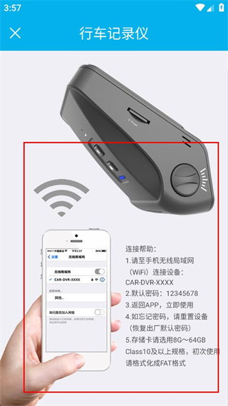 3、查看行车记录仪的连接帮助内容,了解设备连接的具体步骤和注意事项。