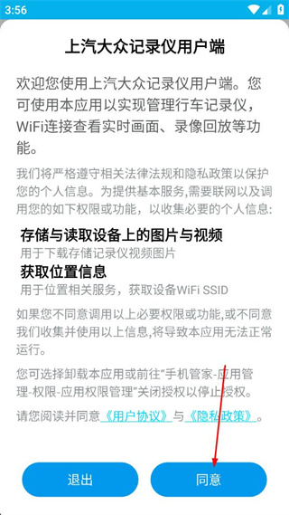 1、打开上汽大众记录仪用户端,阅读相关权限说明,点击同意按钮进入应用。