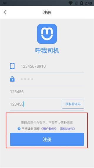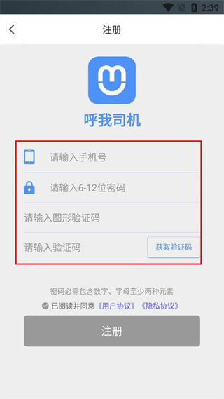 3、在呼我司机注册页面依次填写手机号,设置6-12位密码,输入图形验证码,再输入验证码。