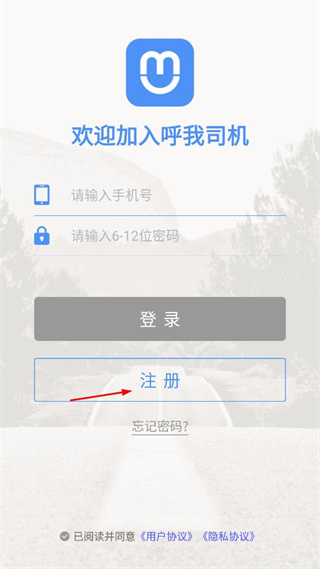 2、在呼我司机登录界面找到注册选项,点击该选项,跳转至呼我司机的注册页面。