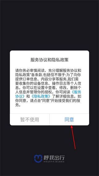 1、阅读服务协议和隐私政策相关内容,确认无误后点击同意按钮,进入呼我司机登录界面。