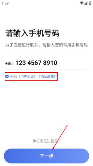3、勾选同意相关协议内容,点击“下一步”按钮推进登录的后续流程。