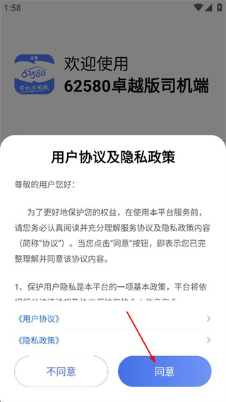 1、打开招招出行司机端,查看弹出的用户协议及隐私政策,点击“同意”按钮继续。