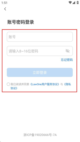 3、在账号密码登录页面,填写信息并勾选协议后,点击立即登录按钮即可完成账号登录。