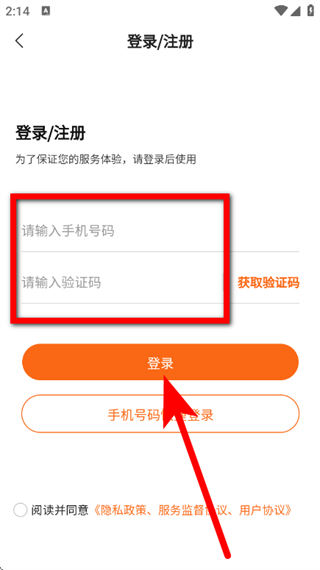 4、在注册页面,输入手机号码和验证码,勾选相关协议后,点击登录,完成账号登录。