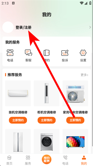 2、在个人页面,点击登录注册,进入登录选择页面。