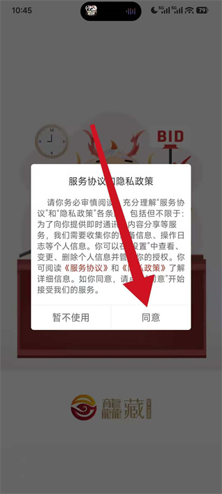 1、打开龘藏后,弹出弹窗,点击同意,进入首页。