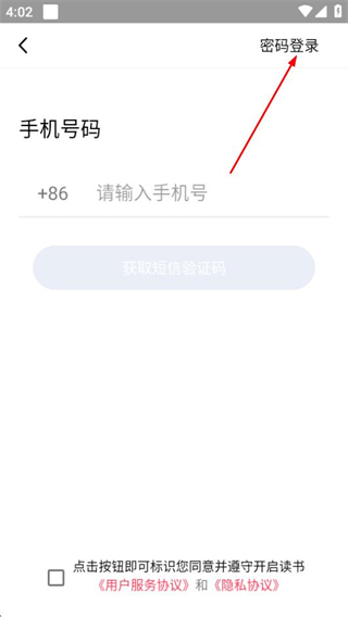 3、在登录页面,点击密码登录选项,可切换至密码登录页面。